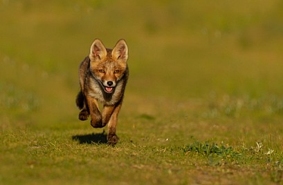 Running red fox cub.