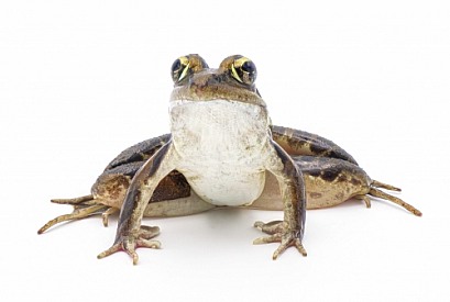 Southern leopard frog - Lithobates sphenocephalus or Rana sphenocephala - isolated on white background front profile view up high showing under belly