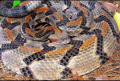 Venomous timber, canebrake banded rattlesnake - Crotalus horridus atricaudatus - coiled showing black chevron pattern, distinctive of the species. Orange, black and grey poisonous pit viper, Georgia