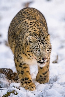 Snow leopard walking in snow