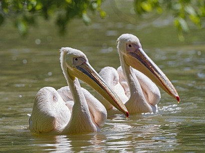 Two pelicans swimming on the water