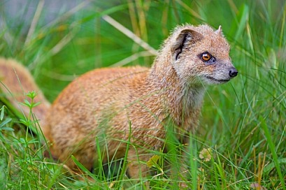 Yellow mongoose posing in the grass