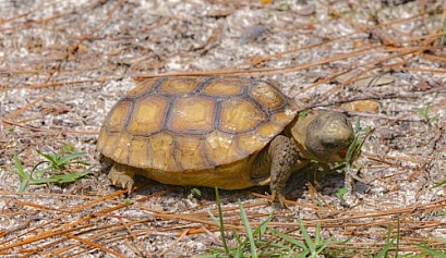 Baby Florida Gopher Tortoise - Gopherus polyphemus - eating plants and grass in native wild Sandhill habitat. Side view with mouth open