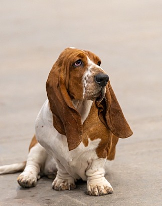 Floppy ear Basset hound sitting