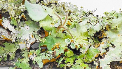 Black cracked Sheet or Netted Ruffle Lichen - Parmotrema reticulatum - used as natural antimicrobial agent against pathogens isolated on white background close up macro view