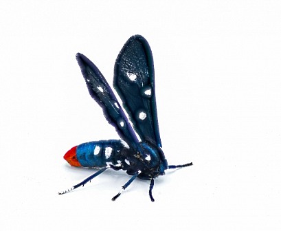 The colorful Oleander Moth, also known as the Polka dot Wasp Moth or Uncle Sam Moth- Syntomeida epilais adult form isolated on white background side view with wings up