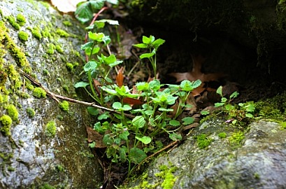 Close up of several small leafy plants growing up between two rocks