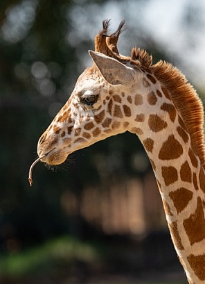 Local zoo giraffe playing with a stick in his mouth