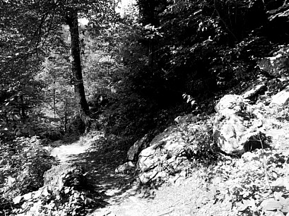 Black and white mountain path and greenery