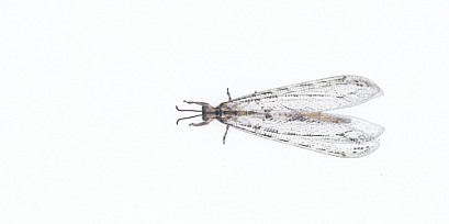 Large adult giant ant lion - Vella Americana. Lace like pattern on wings in great detail. isolated on white background dorsal top view