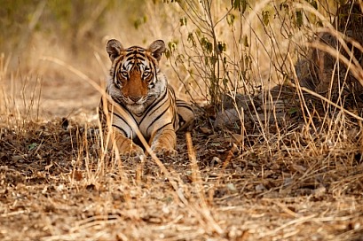 Beautiful tiger in the nature habitat. Tiger pose in amazing light. Wildlife scene with wild animal. Indian wildlife. Indian tiger. Panthera tigris tigris.