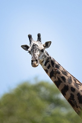 Head shot of a giraffe in Tanzania with Oxpecker birds