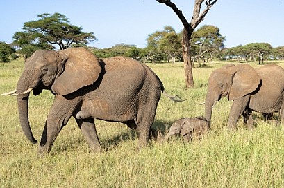Family of elephants walking in line