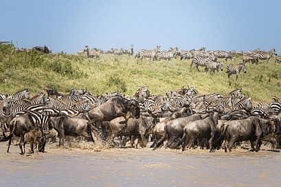 Zebras and Wildebeest at a water hole with a wildebeest jumping