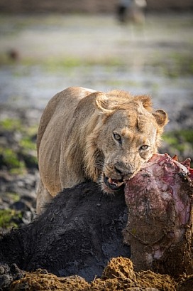 Lion eating buffalo carcass