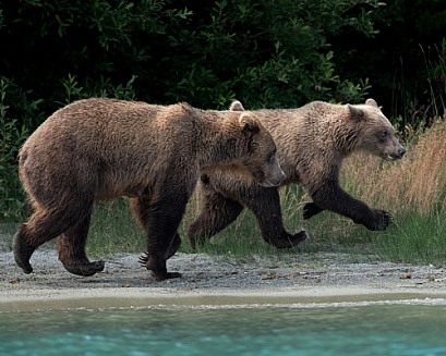 Sow and year old cub on the shore of a lake