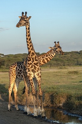 Two giraffes at sunset by the water