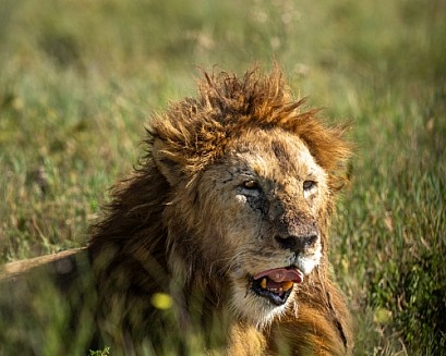 Older lion lying in the grass
