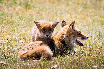 Red foxes playing in the grass