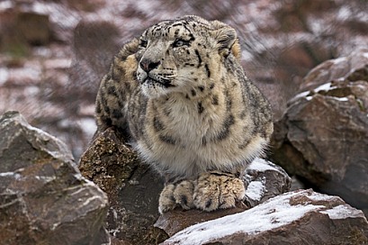 Snow Leopard Crouched on Snowy Rocks