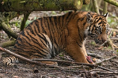 Sumatran Tiger Cub Sitting In Trees
