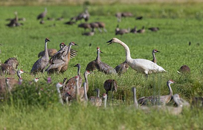 Trumpeter Swan Having A Dispute With A Sandhill Crane