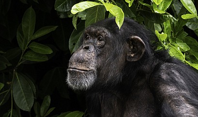 Chimpanzee Looking Up With Natural Leaves Around Her