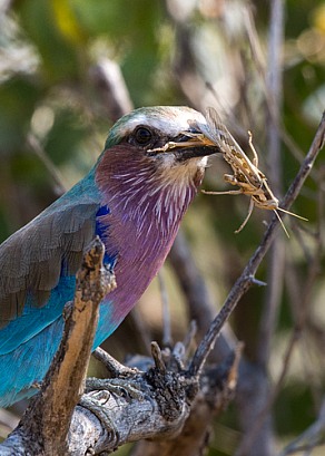 Lilac breasted roller with grasshopper