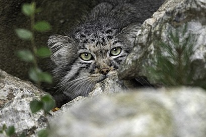 Manul/Pallas Cat Looking Out Of Hiding Place In Rocks