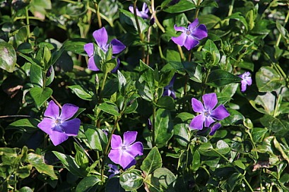 close-up view of beautiful blue periwinkle flowers with green leaves at sunny day