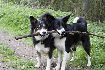 Border collies playing with stick