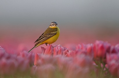 Yellow Wagtail on tulips