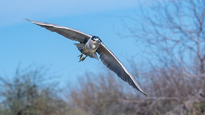 Night Heron with intense red eyes in flight