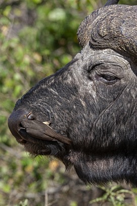 Red-billed oxpecker feeding on a Buffalo