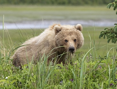 Alaskan brown bear in the tall grass looking around