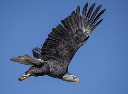 Adult bald eagle flying against the sky
