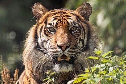 Sumatran Tiger Close Up Face Long Grass Teeth Showing