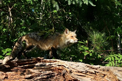 Curious fox on top of log