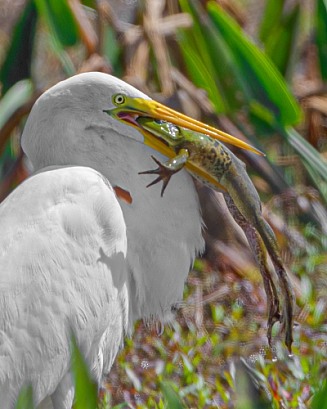 Great White Egret - Ardea alba - catching and eating American bullfrog - Lithobates catesbeianus