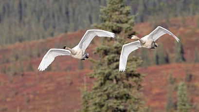 Trumpeter Swan Pair flying in Alaska