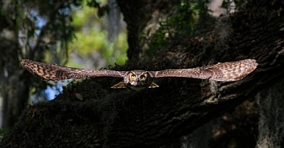 Great horned owl adult (bubo virginianus) flying towards camera from oak tree