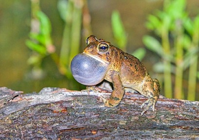 Male southern toad (Anaxyrus terrestris) calling or vocalizing on wet log