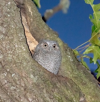 Eastern screech owl (Megascops asio) baby looking out of nesting cavity in a turkey oak tree (Quercus laevis)