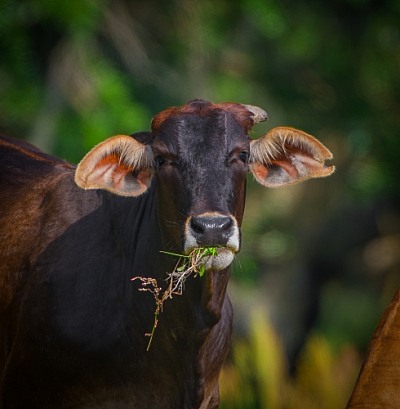 Brown cow with big ears, eating weeds in mouth, looking at camera, black wet nose, bokeh background, pasture grazing, north Florida livestock