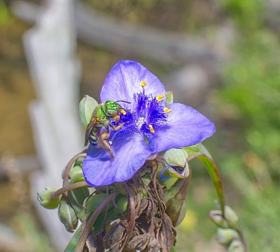 Agapostemon splendens - Brown winged Striped Sweat bee on Tradescantia ohiensis, commonly known as bluejacket or Ohio spiderwort