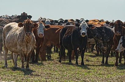 Group of cows standing in pasture meadow, looking at camera