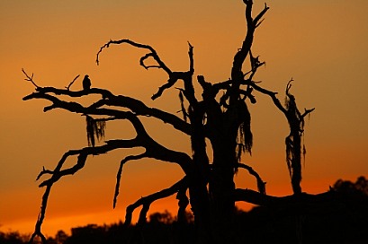 Red tailed hawk - Buteo jamaicensis -silhouette perched on dead oak tree with orange sunset background