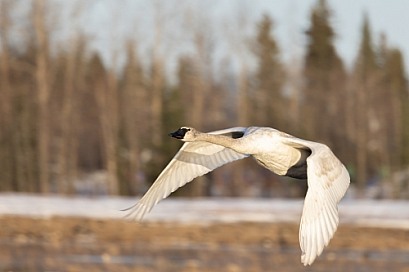 Trumpeter Swan Flying over a Field in Alaska