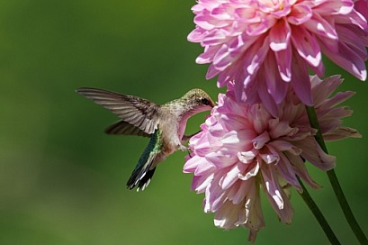 Young hummingbird checking a dahlia flower
