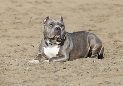 Gray pitbull at the beach in the sand